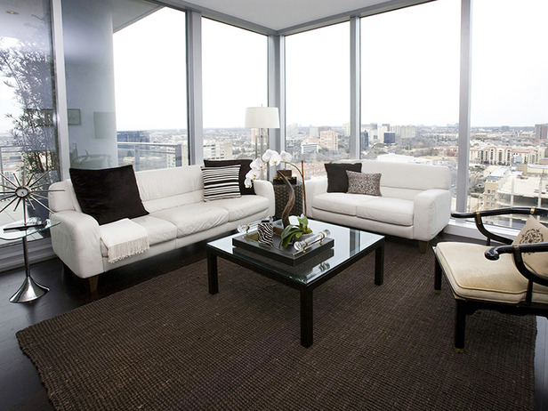 Ezelle designs a bachelor pad to create a masculine yet seductive look great for throwing parties. This 15x17-square-foot room needed to have lots of space and places to sit. The look is achieved by combining contrasting colors of green ottomans with light furniture and warm browns.